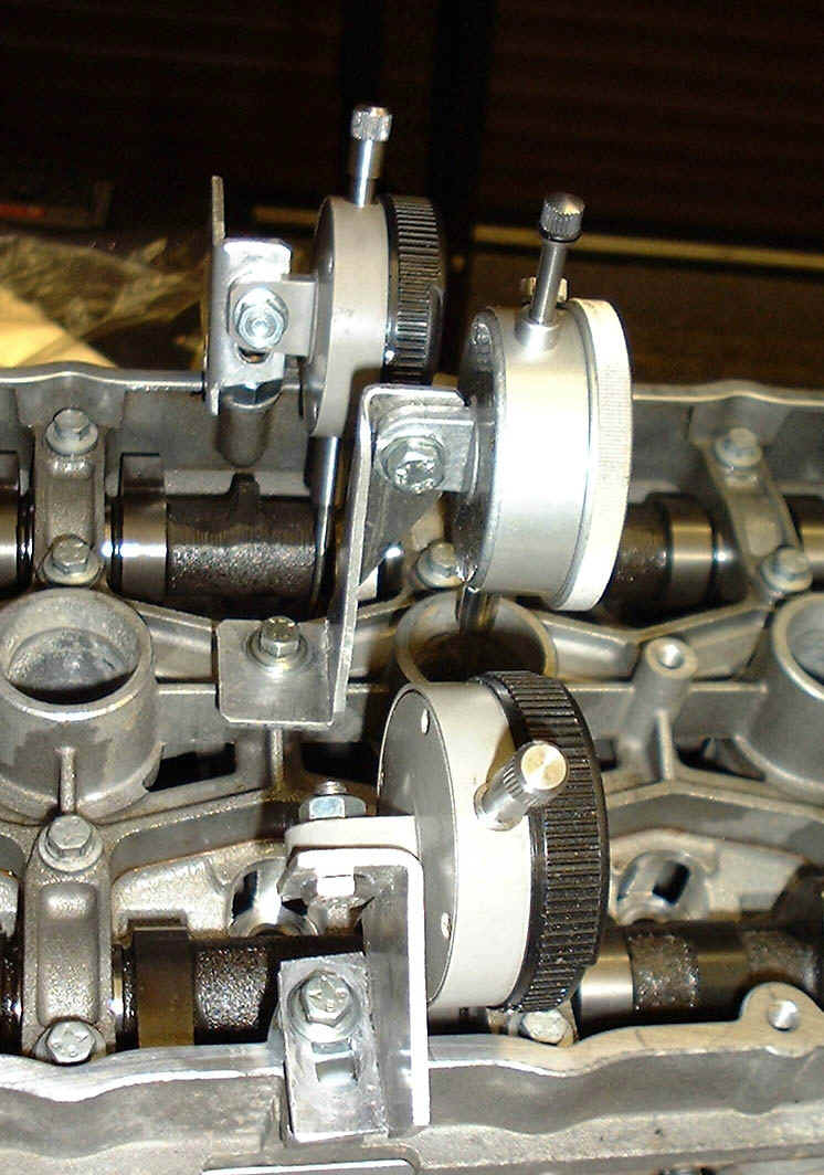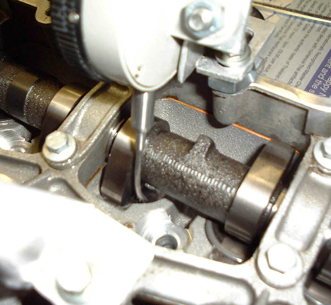 the cam cover bolt holes, the gauge probe is set to touch the top of the rearmost cam